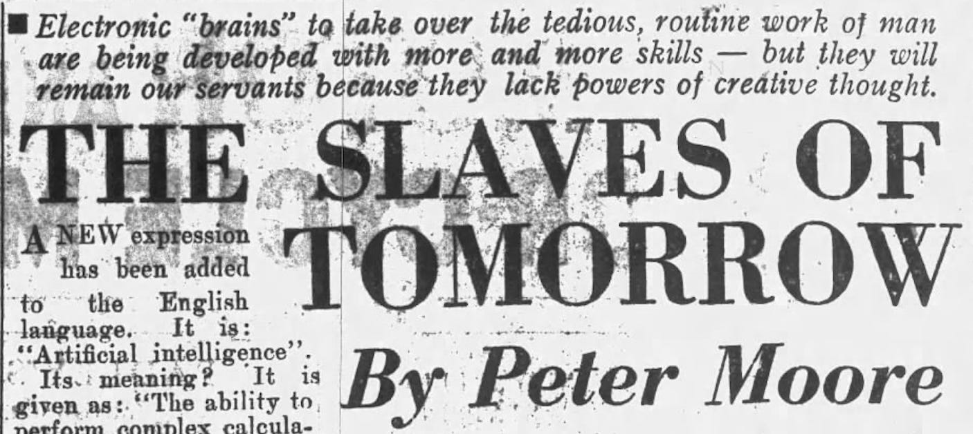 “Electronic ‘brains’ to take over the tedious, routine work of man are being developed with more and more skills — but they will remain our servants because they lack powers of creative thought.”