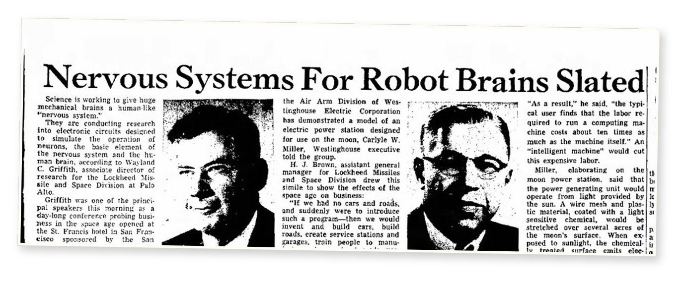 “Nervous Systems For Robot Brains Slated” from The Times (San Mateo) on March 11, 1959, reports on a day-long conference at the St. Francis Hotel in San Francisco where Wayland C. Griffith, associate director of research for Lockheed’s Missiles and Space Division at Palo Alto, described ongoing efforts to give machines a human-like “nervous system.”